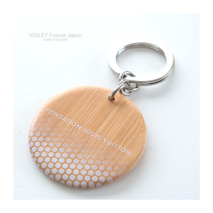 天然木材にグラデーション状にドットがデザインされFONDATION LOUIS VUITTONとロゴが入ったスタイリッシュなキーホルダー/キーリングです。